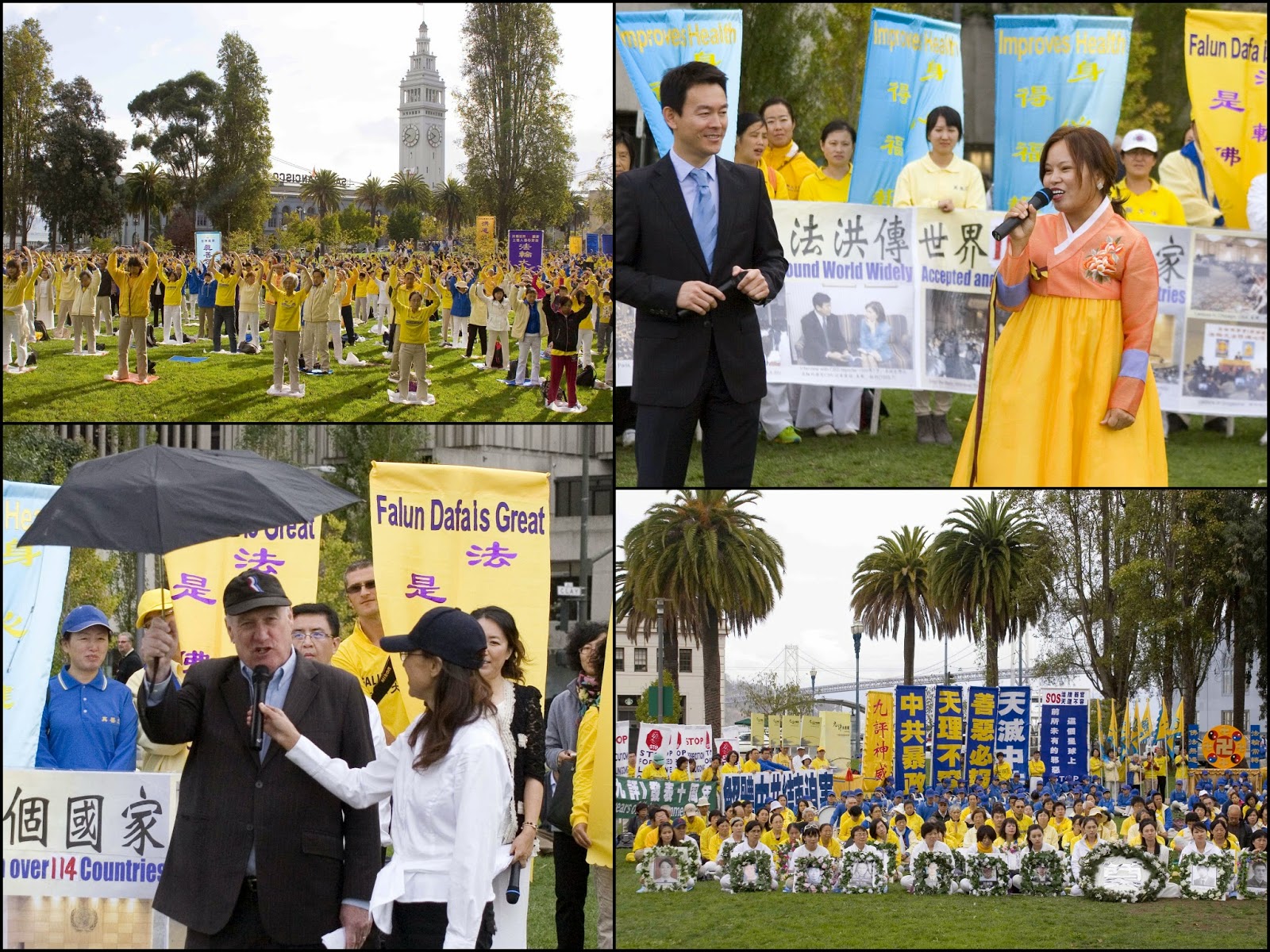 【明慧網二零一四年十月十六日】(明慧記者王英舊金山報導)二零一四年十月十五日,近兩千名法輪功學員在美國舊金山市府前廣場和位於金融區的蘇•比爾曼公園(Sue Bierman Park)舉行煉功、遊行和集會,呼喚良心,解體迫害。