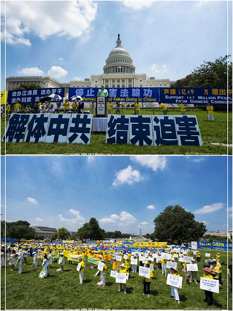 【明 慧網二零一三年七月十九日】(明慧記者李靜菲華盛頓DC報導)二零一三年七月十八日中午,來自美國東部的大約一千五百名法輪功學員冒著酷暑,在美國首都華 盛頓DC國會山西草坪舉行集會,呼籲制止中共對法輪功長達十四年的殘酷迫害。美國國會議員和非政府組織代表到場聲援。