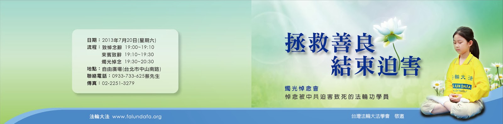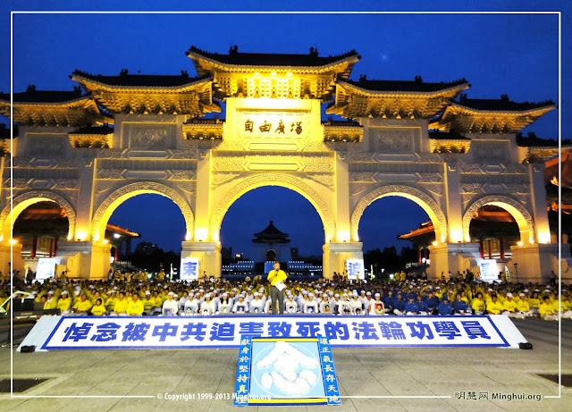 【明 慧網二零一三年七月二十二日】(明慧記者沈容、鄭語焉、周容、劉文新台灣台北採訪報導)二零一三年七月二十日晚,當台北上空的夜幕緩緩降臨,自由廣場上的 法輪功學員,點起了一盞盞燭光,悼念十四年來用生命捍衛真理、被中共迫害致死的中國大陸同修。支持法輪功的各界代表紛紛上台發言,感佩學員們多年奮力不 懈、講清真相的努力,並大聲疾呼中共立即停止對法輪功學員的迫害!