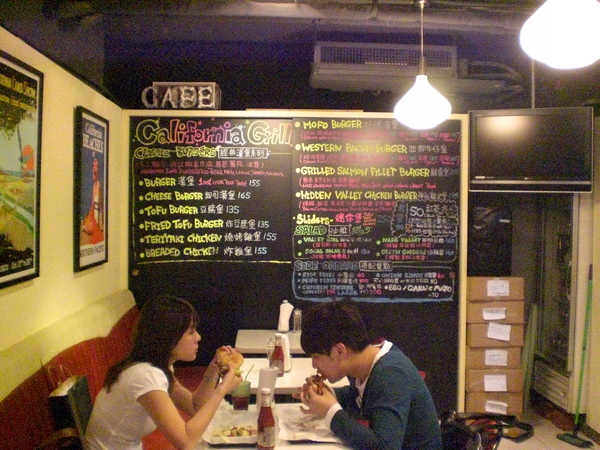 加州燒烤堡敦化店真的很好找,就是 Sogo 百貨正後方,店面小小的一間,最多只能容納十來位客人,雖然說這次去的時候沒有高朋滿座,但是客人的川流率頗高,看來應該不至於會踩雷陣亡吧!看著黑板上的菜單,很快就決定好今天晚餐的內容,服務人員很貼心提出省錢的配法,我跟阿滿也就欣然接受了。