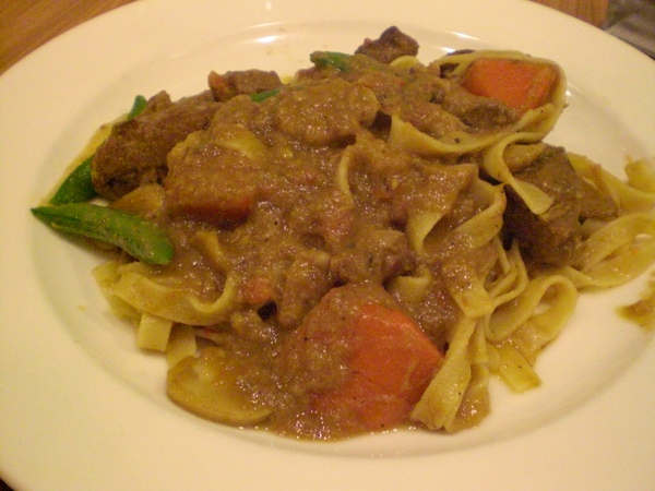寬麵本身頗具彈性,沾附在上頭的肉醬味道香醇卻不會過於濃郁,鹹甜剛剛好,搭起寬麵來很讚
