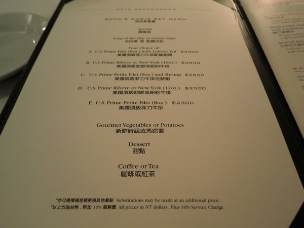 內容包括餐前麵包、開胃酒、凱薩沙拉 or 每日例湯(這次是洋蔥湯)、主菜、配菜、甜點與飲料