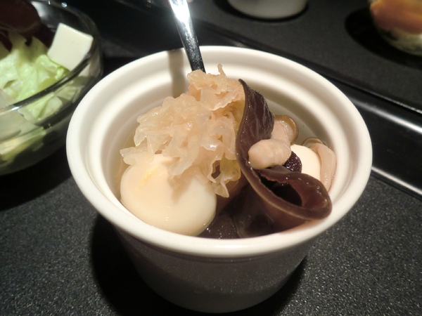 養生鮮菇湯 (上左) 裏頭有黑、白木耳、寒天塊、鵪鶉蛋等,湯頭味道蠻清爽的