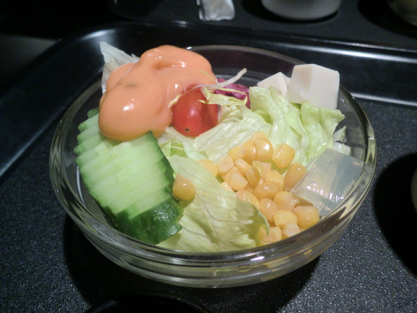 生菜沙拉 (上右) 水分有完全瀝乾,吃起來很爽口,裡面還加有豆腐丁與寒天塊