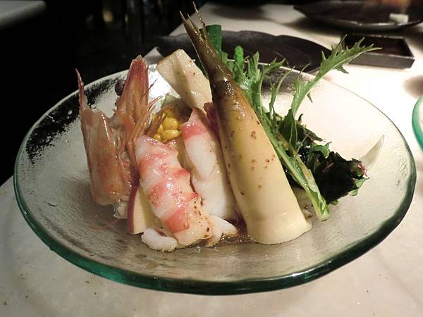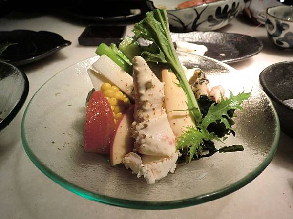 沙拉內容有蘆筍、山藥、小黃瓜、蘋果片、美生菜等等,佐上滋味酸甜的油醋醬,頗為開胃