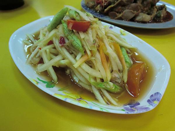 滋味酸甜的涼拌木瓜絲 (上左) ,裡頭有番茄片、四季豆等,清爽開胃;麻辣雞胗 (上右) 口感爽脆,香辣帶勁