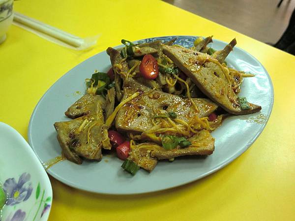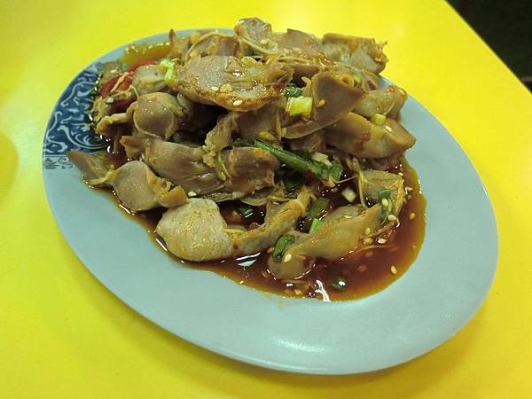 而同樣香辣帶勁的麻辣豬肝 (下左),則是多了薑絲去腥提味,而豬肝本身質地不會過老,蠻好吃的